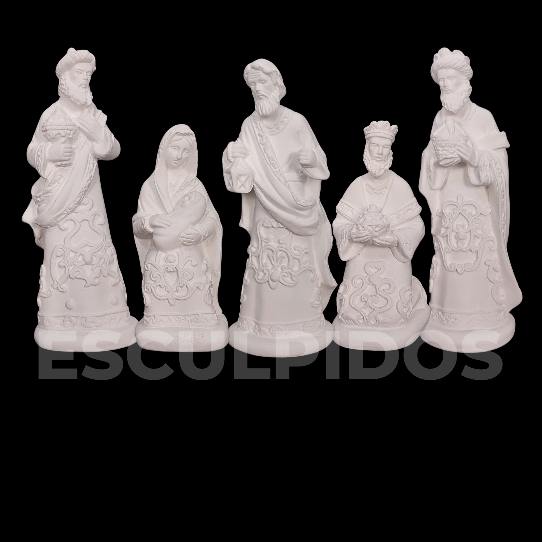 – Presépio Bordado 5 Peças (17cm) – Peça Decorativa em Gesso Natural para Personalização